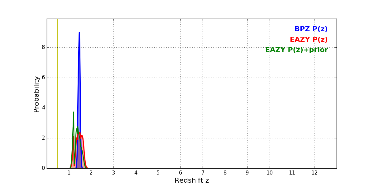In P(z) plots: Yellow lines mark the cluster redshift z = 0.505,