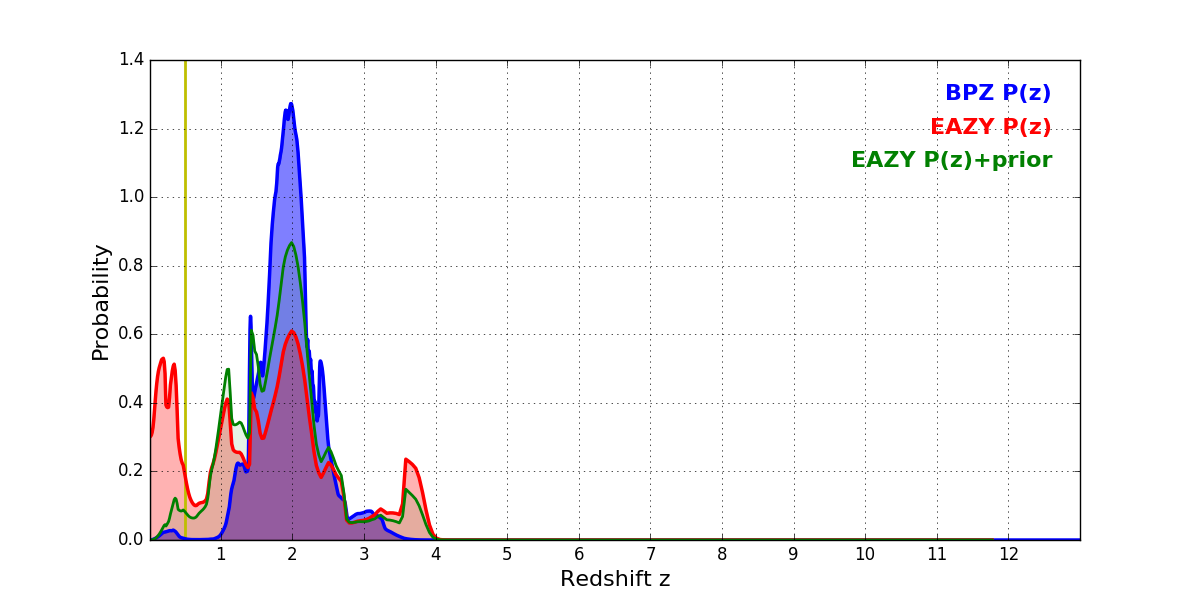 In P(z) plots: Yellow lines mark the cluster redshift z = 0.505,