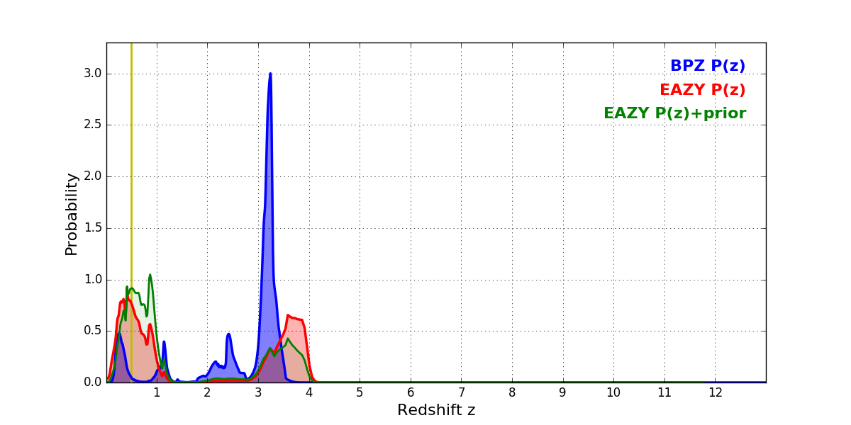 In P(z) plots: Yellow lines mark the cluster redshift z = 0.505,
