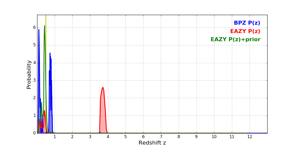 In P(z) plots: Yellow lines mark the cluster redshift z = 0.505,