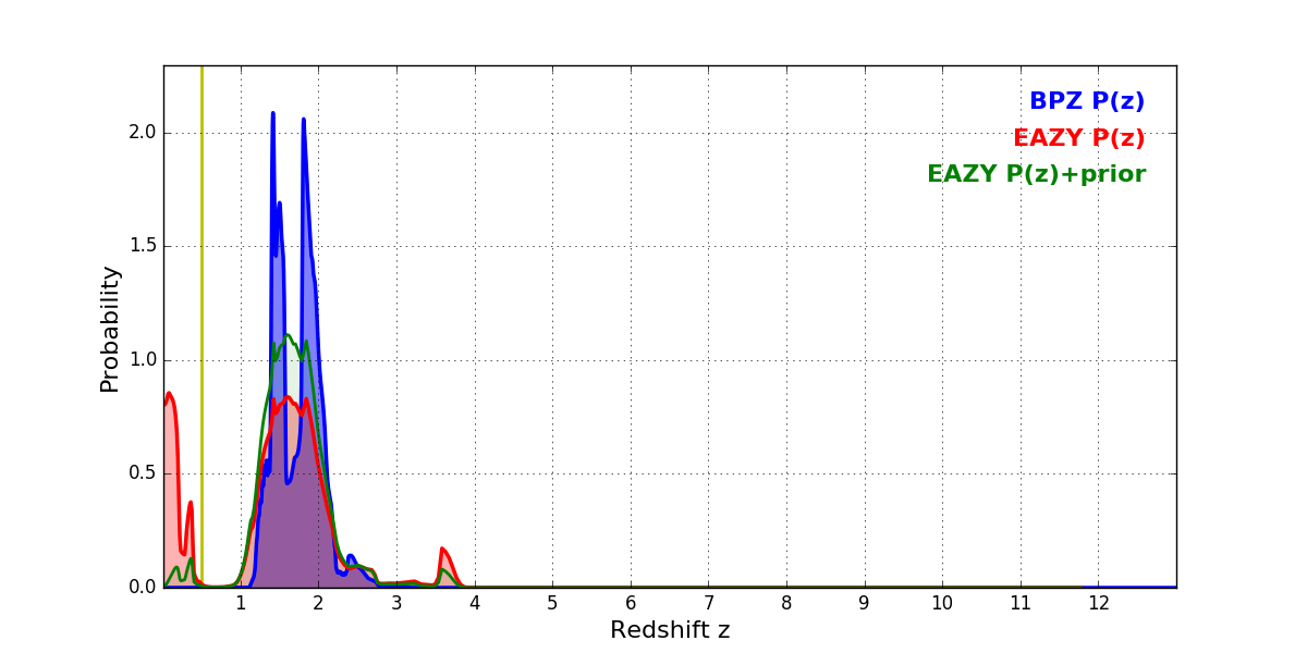 In P(z) plots: Yellow lines mark the cluster redshift z = 0.505,