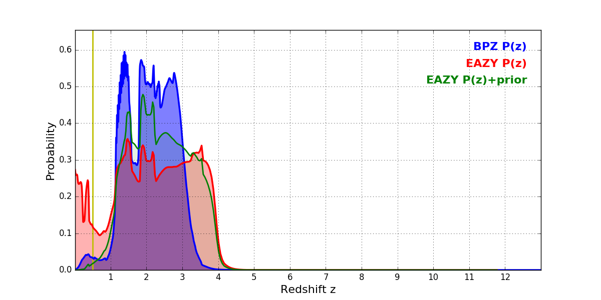 In P(z) plots: Yellow lines mark the cluster redshift z = 0.505,
