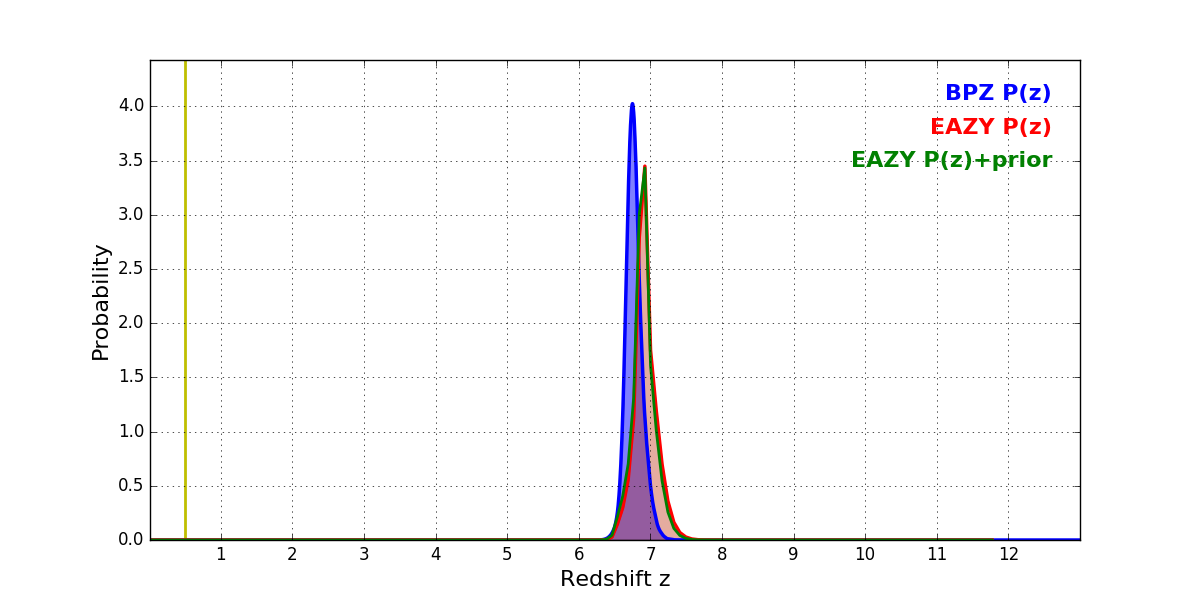 In P(z) plots: Yellow lines mark the cluster redshift z = 0.505,