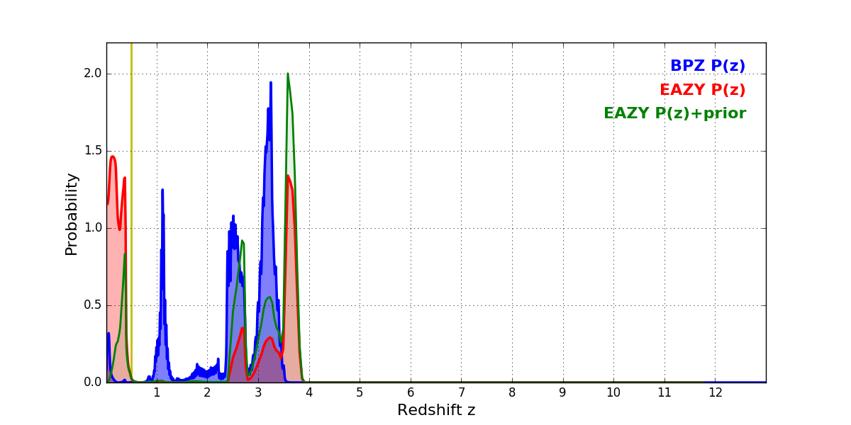 In P(z) plots: Yellow lines mark the cluster redshift z = 0.505,