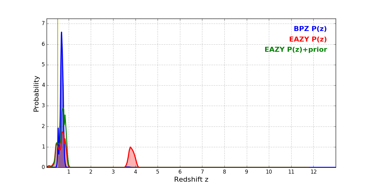 In P(z) plots: Yellow lines mark the cluster redshift z = 0.505,