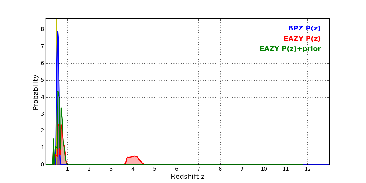 In P(z) plots: Yellow lines mark the cluster redshift z = 0.505,