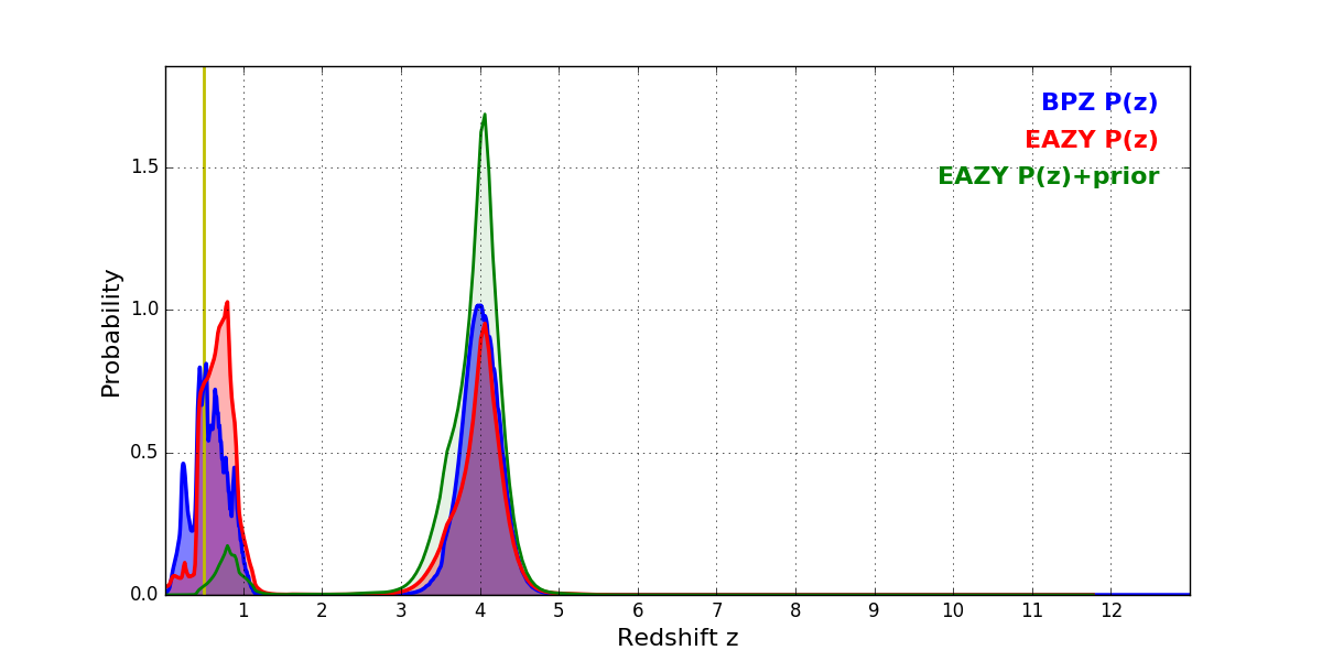 In P(z) plots: Yellow lines mark the cluster redshift z = 0.505,