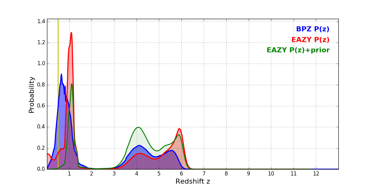 In P(z) plots: Yellow lines mark the cluster redshift z = 0.505,