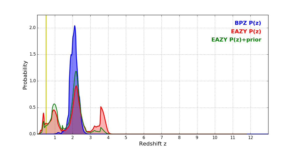 In P(z) plots: Yellow lines mark the cluster redshift z = 0.505,