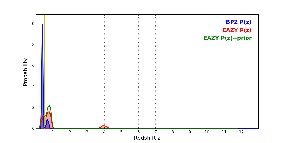 In P(z) plots: Yellow lines mark the cluster redshift z = 0.505,