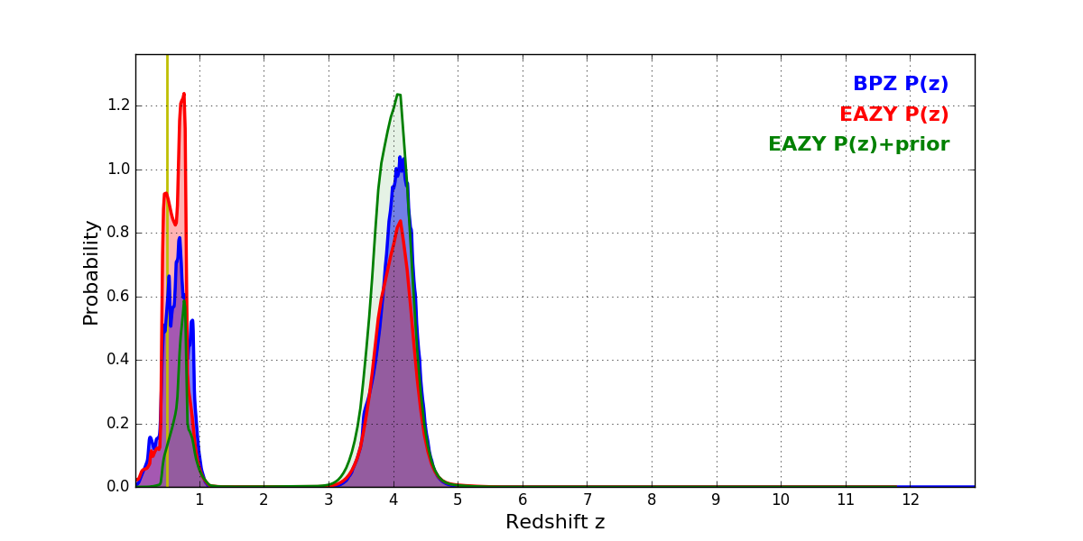 In P(z) plots: Yellow lines mark the cluster redshift z = 0.505,