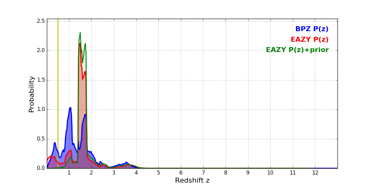 In P(z) plots: Yellow lines mark the cluster redshift z = 0.505,