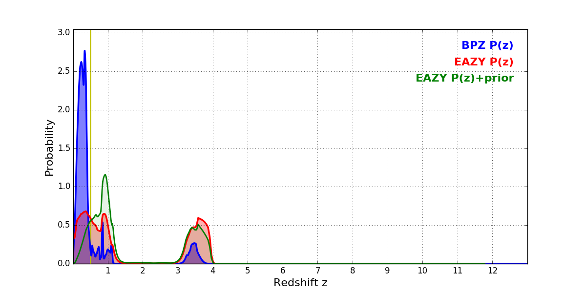 In P(z) plots: Yellow lines mark the cluster redshift z = 0.505,