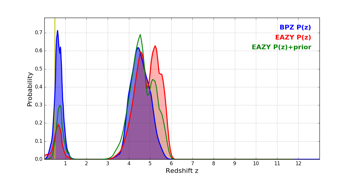 In P(z) plots: Yellow lines mark the cluster redshift z = 0.505,