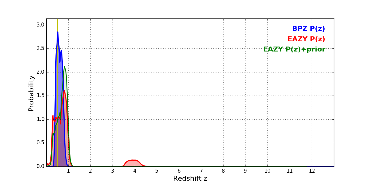 In P(z) plots: Yellow lines mark the cluster redshift z = 0.505,