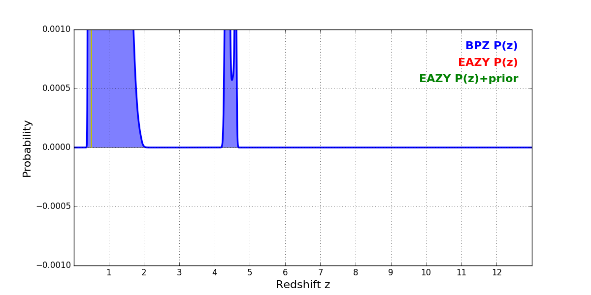 In P(z) plots: Yellow lines mark the cluster redshift z = 0.505,