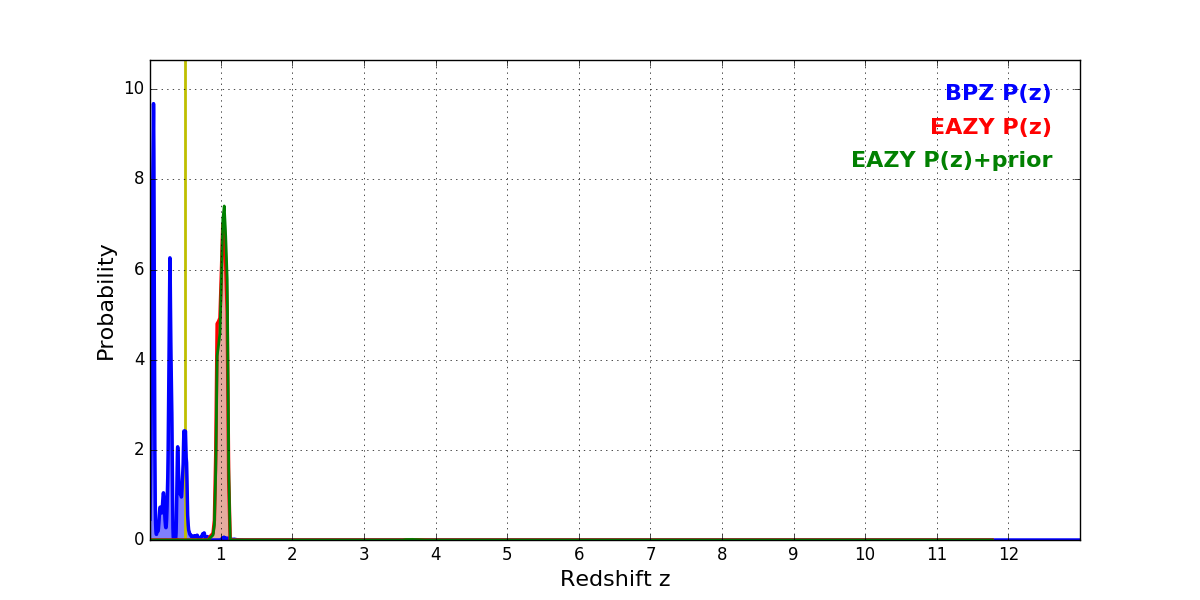 In P(z) plots: Yellow lines mark the cluster redshift z = 0.505,