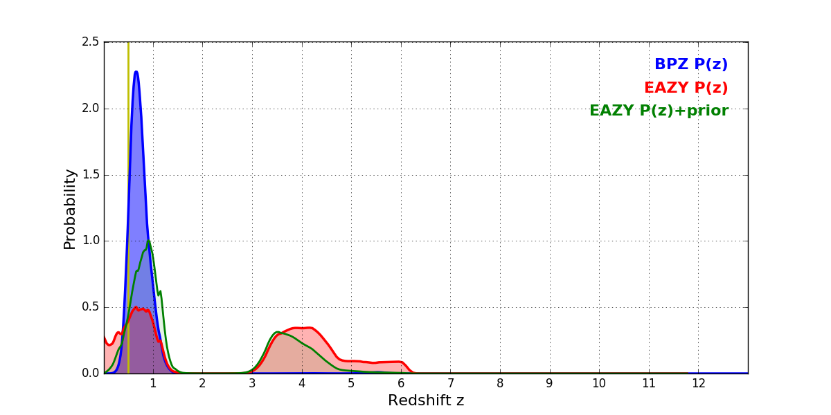 In P(z) plots: Yellow lines mark the cluster redshift z = 0.505,