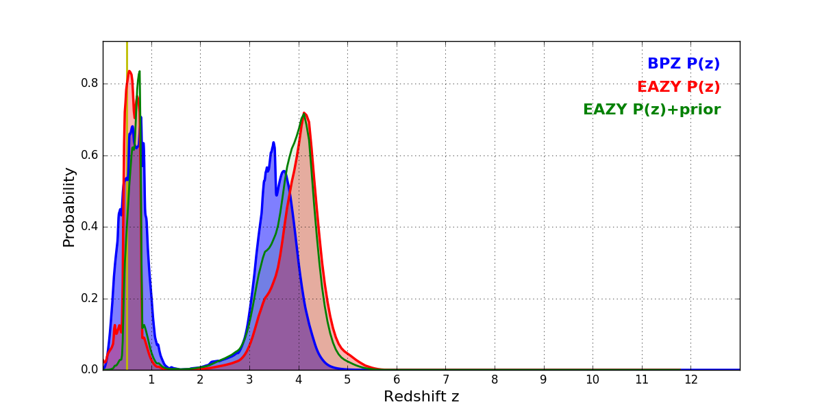 In P(z) plots: Yellow lines mark the cluster redshift z = 0.505,