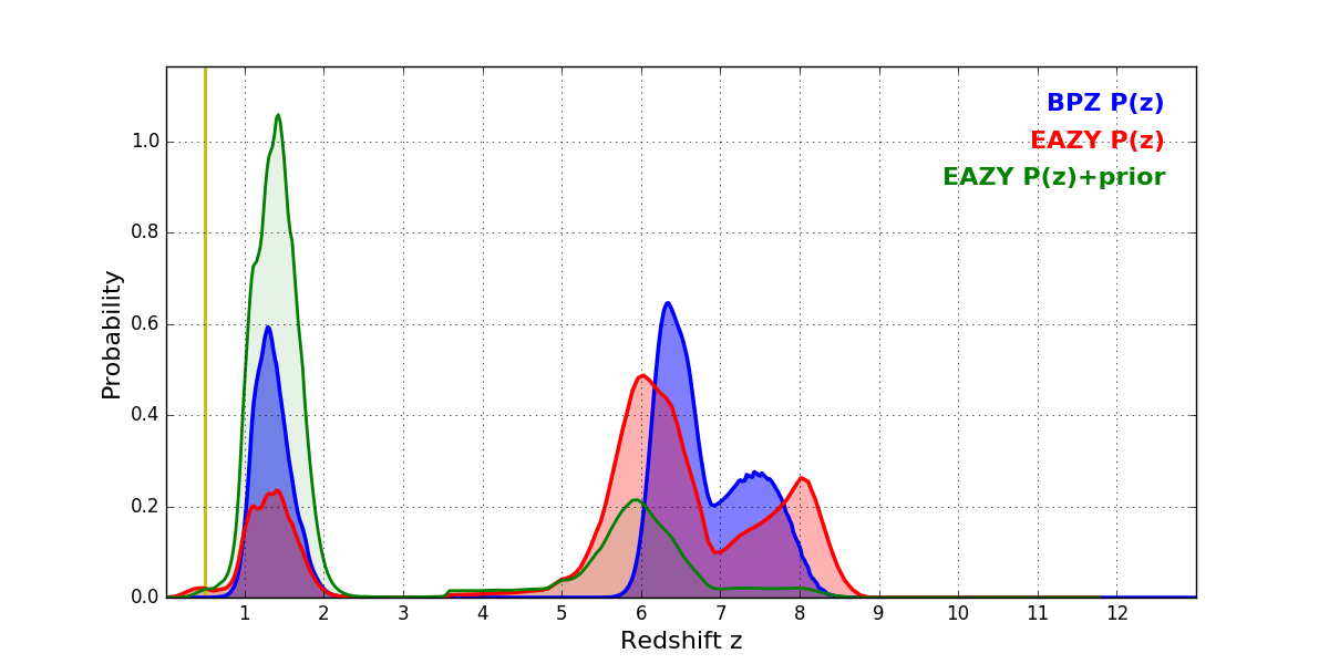 In P(z) plots: Yellow lines mark the cluster redshift z = 0.505,