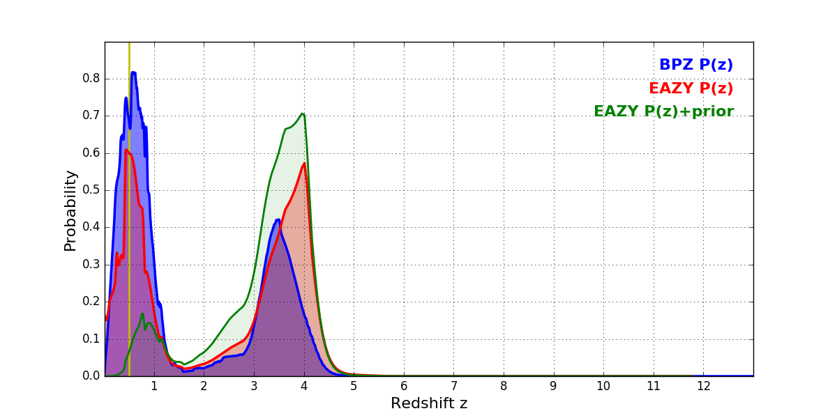 In P(z) plots: Yellow lines mark the cluster redshift z = 0.505,