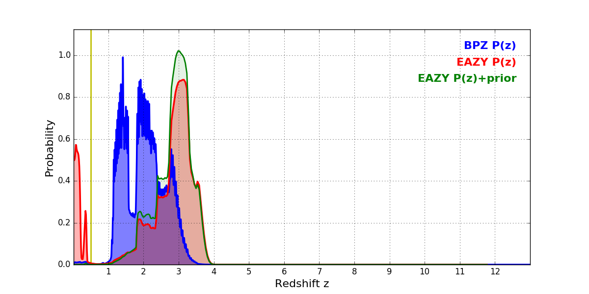 In P(z) plots: Yellow lines mark the cluster redshift z = 0.505,