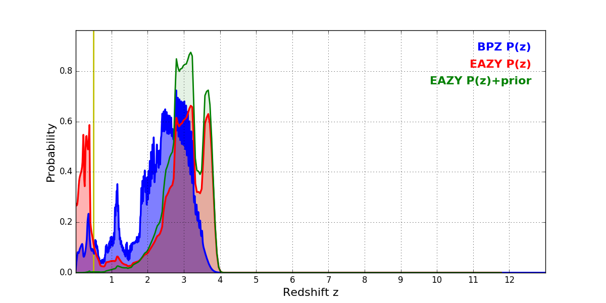 In P(z) plots: Yellow lines mark the cluster redshift z = 0.505,