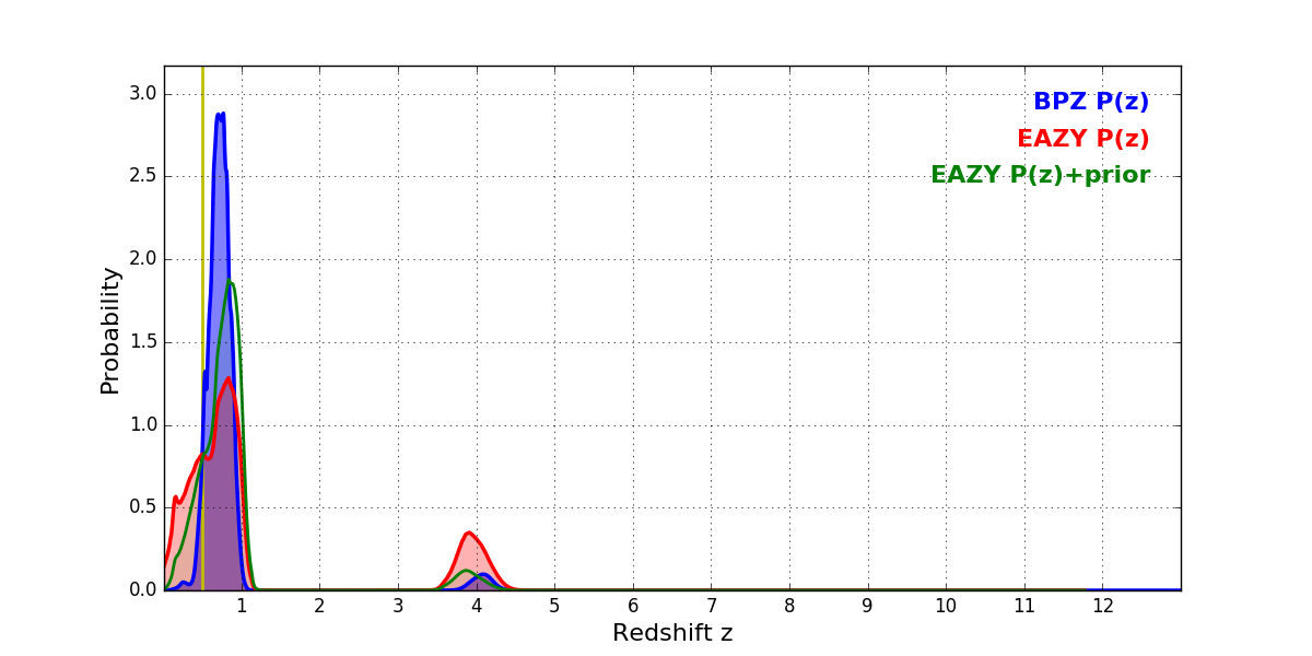 In P(z) plots: Yellow lines mark the cluster redshift z = 0.505,