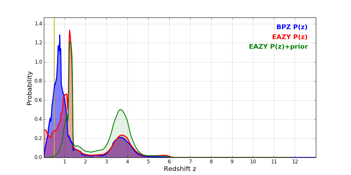 In P(z) plots: Yellow lines mark the cluster redshift z = 0.505,