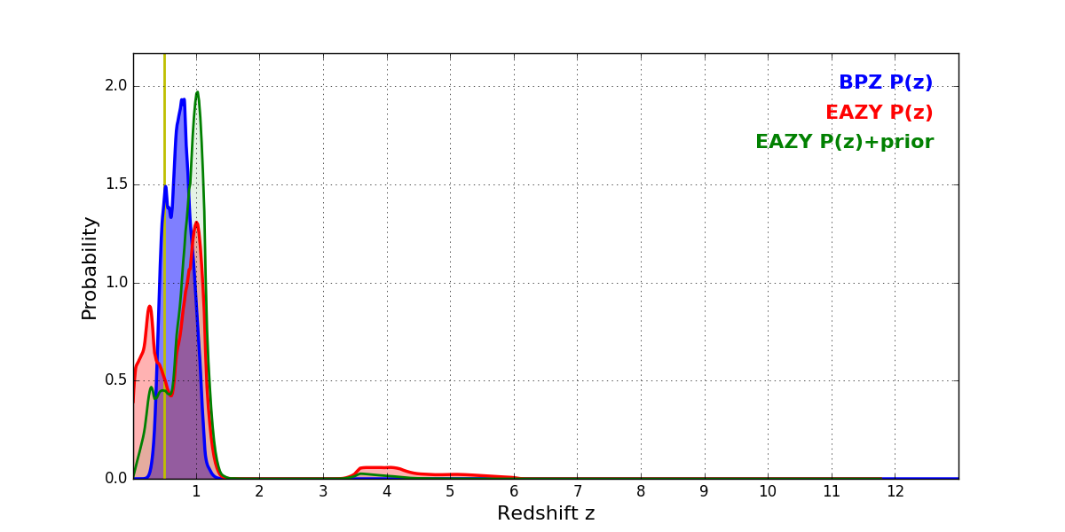 In P(z) plots: Yellow lines mark the cluster redshift z = 0.505,