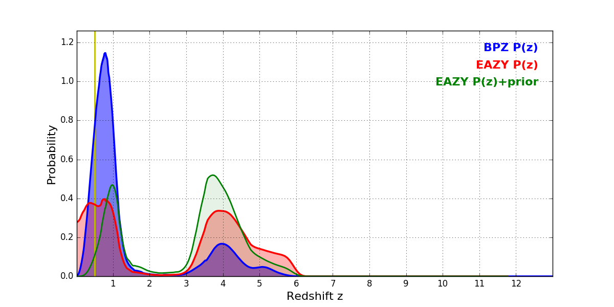 In P(z) plots: Yellow lines mark the cluster redshift z = 0.505,