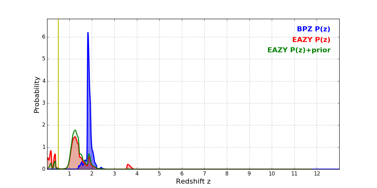 In P(z) plots: Yellow lines mark the cluster redshift z = 0.505,