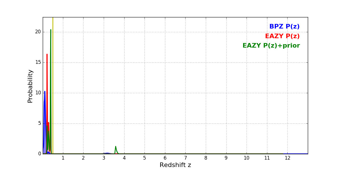 In P(z) plots: Yellow lines mark the cluster redshift z = 0.505,