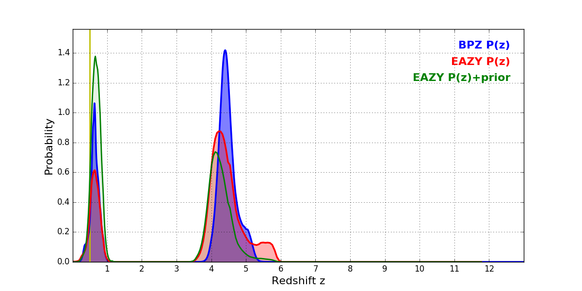 In P(z) plots: Yellow lines mark the cluster redshift z = 0.505,