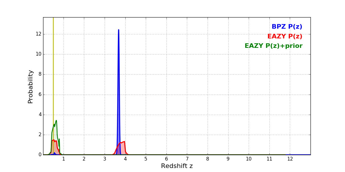 In P(z) plots: Yellow lines mark the cluster redshift z = 0.505,