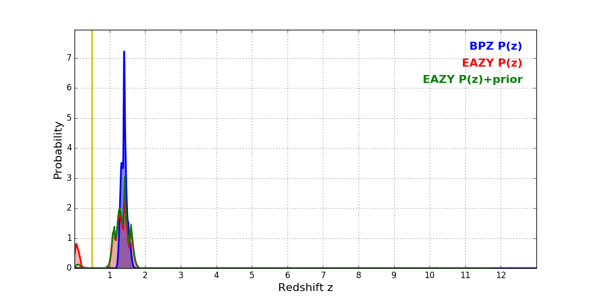 In P(z) plots: Yellow lines mark the cluster redshift z = 0.505,
