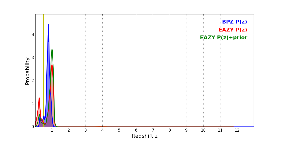 In P(z) plots: Yellow lines mark the cluster redshift z = 0.505,