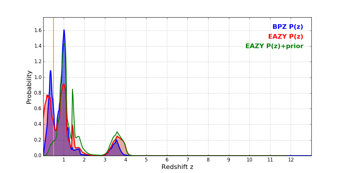 In P(z) plots: Yellow lines mark the cluster redshift z = 0.505,