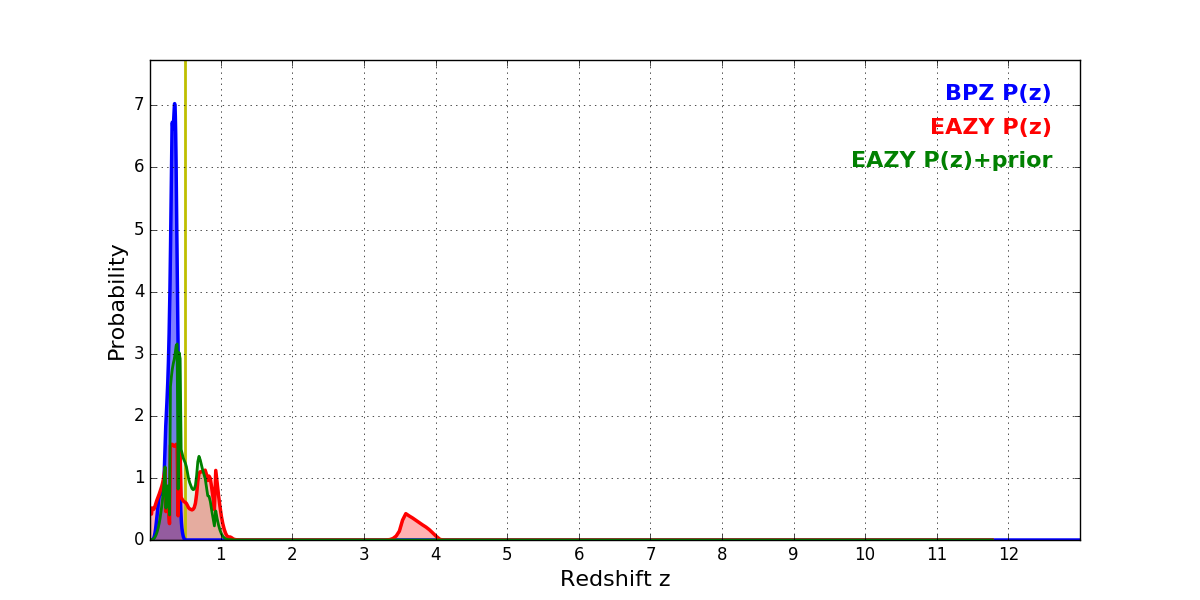 In P(z) plots: Yellow lines mark the cluster redshift z = 0.505,
