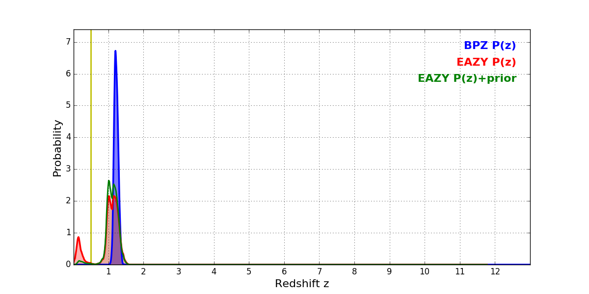 In P(z) plots: Yellow lines mark the cluster redshift z = 0.505,