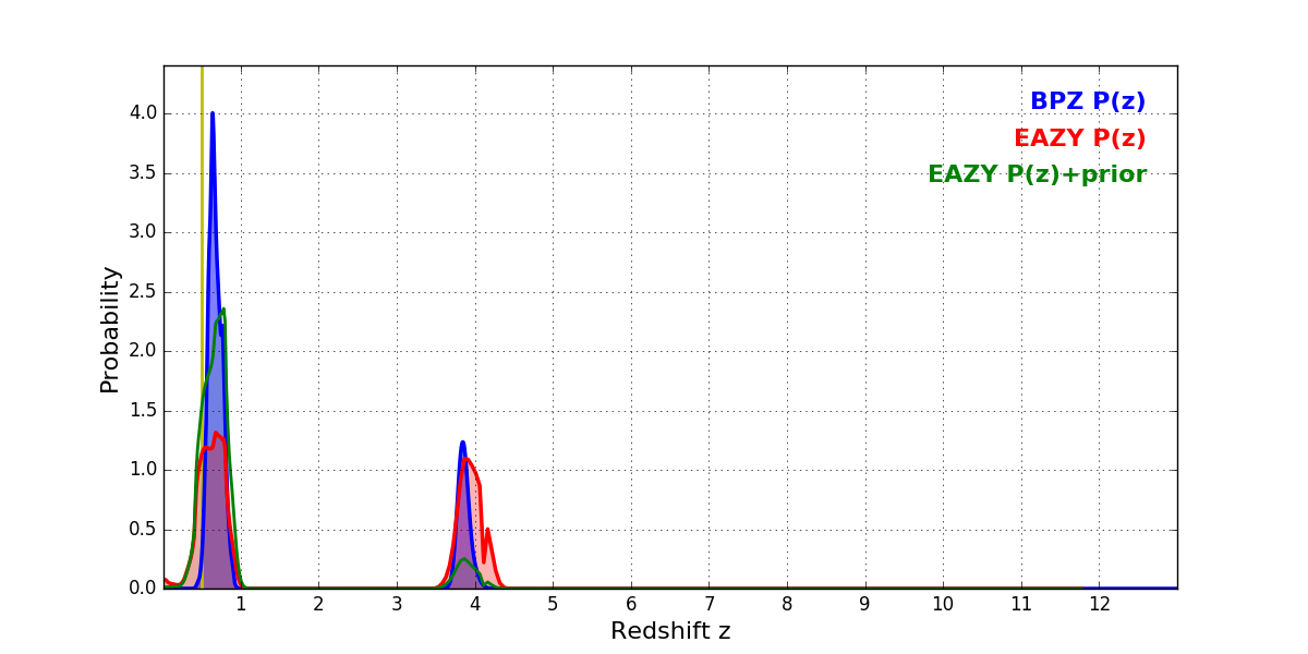 In P(z) plots: Yellow lines mark the cluster redshift z = 0.505,
