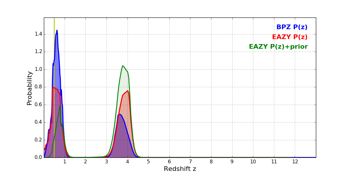 In P(z) plots: Yellow lines mark the cluster redshift z = 0.505,