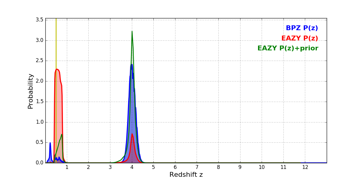 In P(z) plots: Yellow lines mark the cluster redshift z = 0.505,