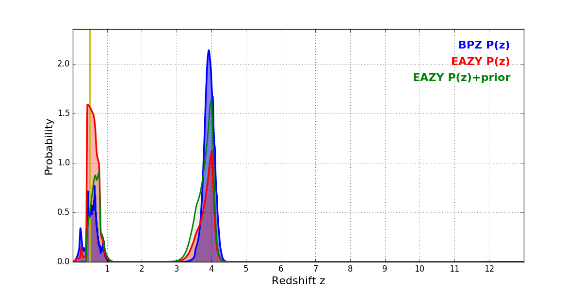 In P(z) plots: Yellow lines mark the cluster redshift z = 0.505,