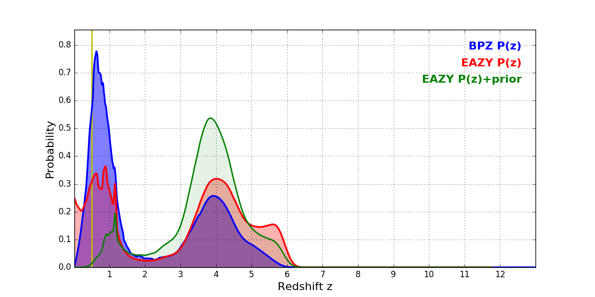 In P(z) plots: Yellow lines mark the cluster redshift z = 0.505,