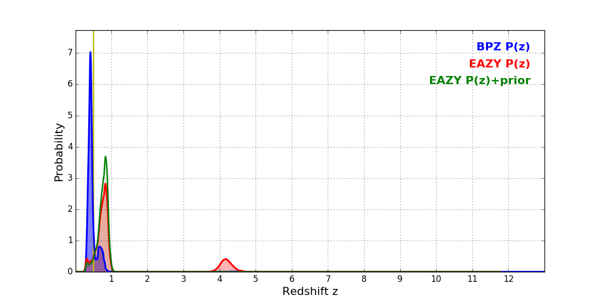 In P(z) plots: Yellow lines mark the cluster redshift z = 0.505,