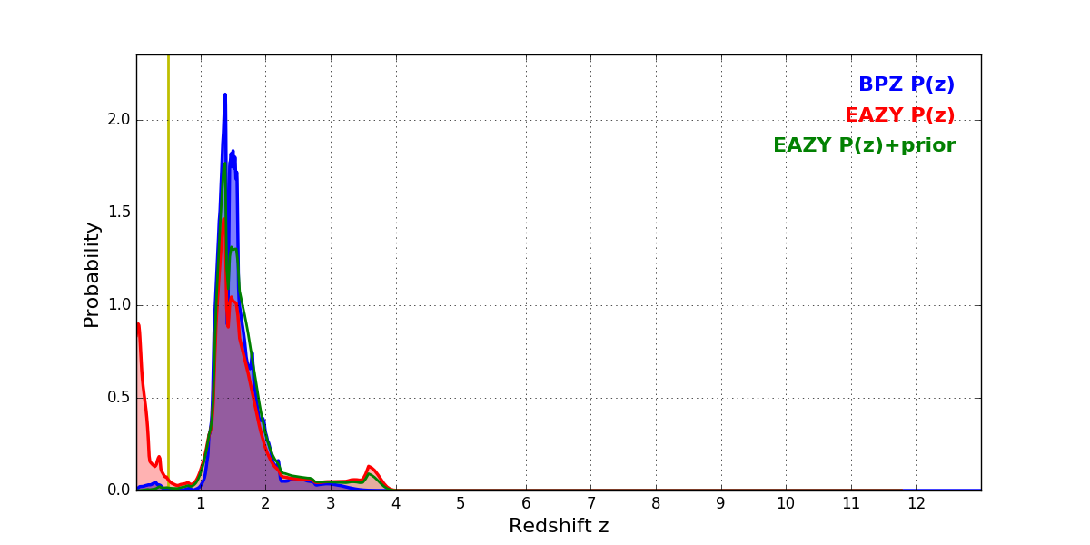 In P(z) plots: Yellow lines mark the cluster redshift z = 0.505,