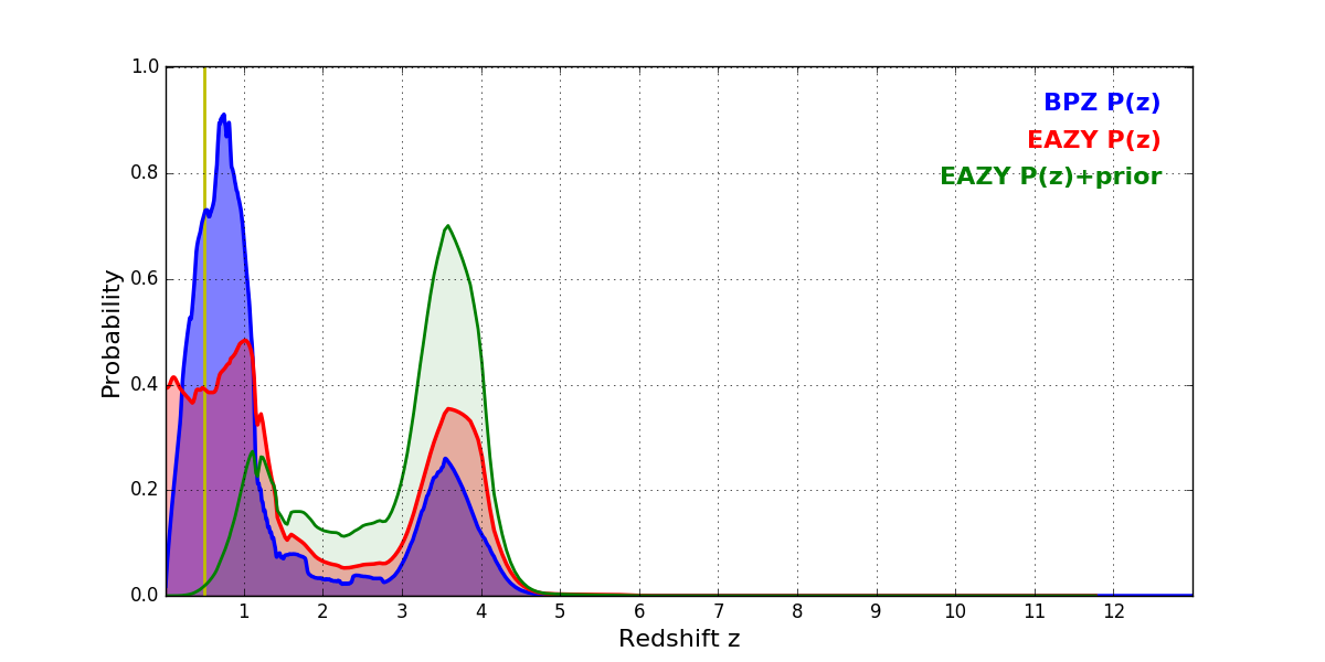 In P(z) plots: Yellow lines mark the cluster redshift z = 0.505,