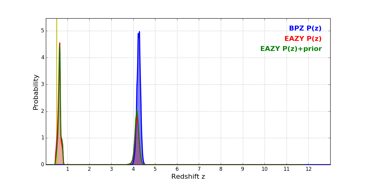 In P(z) plots: Yellow lines mark the cluster redshift z = 0.505,
