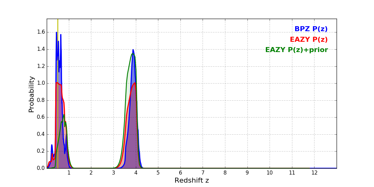 In P(z) plots: Yellow lines mark the cluster redshift z = 0.505,